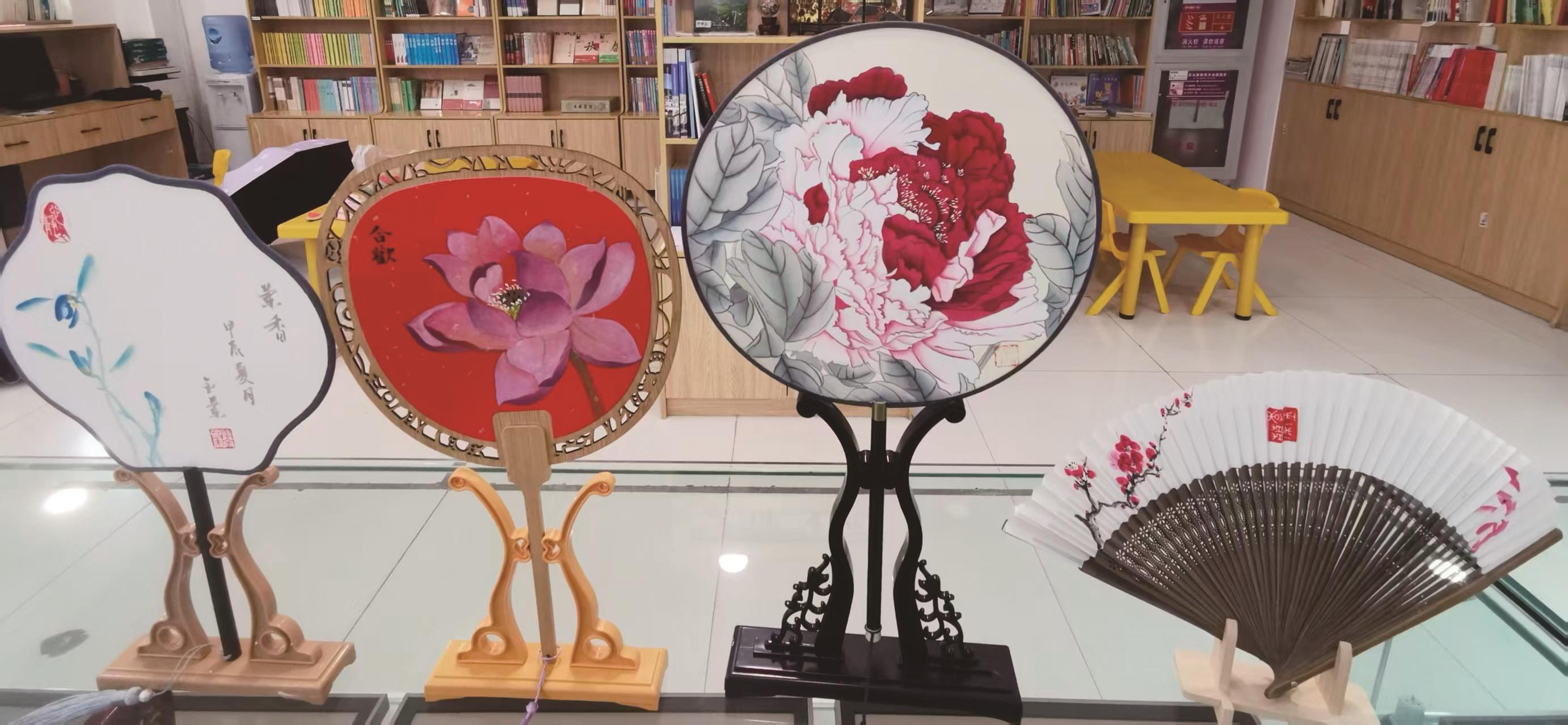 体验,从画扇面开始,先用铅笔在素丝面上画草图,山水、花鸟、人物皆可入画;再用毛笔蘸上调好的水彩,工笔画出。画时得有一定的悬腕功底,用笔达到“翩若惊鸿,婉若游龙”的丝滑、流畅。传承人还提到“三矾九染”的技法,即在扇面上绘制时,通过多次染色和涂刷矾水达到理想效果。