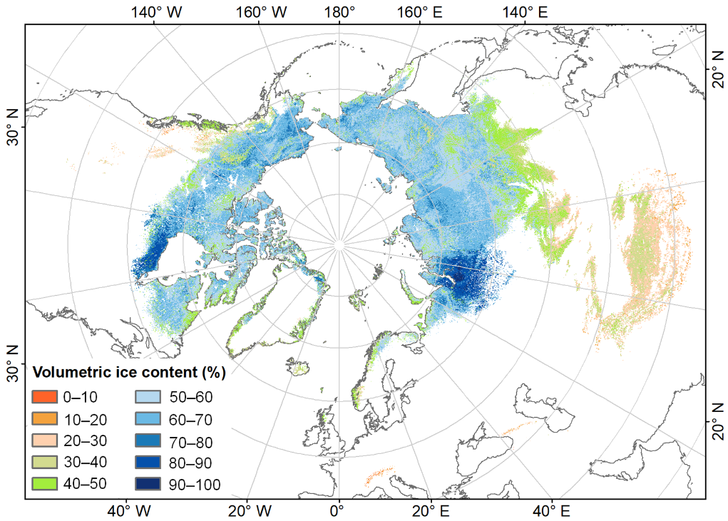 该数据集显示,北半球多年冻土上限以下5米范围内的地下冰总储量约为54600立方公里,是之前基于国际冻土协会地下冰分布图估算结果的两倍多,在空间格局上基本一致,但空间细节得到了显著提升。该高分辨率地下冰分布图可为模拟多年冻土变化及评估其在气候、水文、生态系统和基础设施等方面的影响提供关键数据支持。