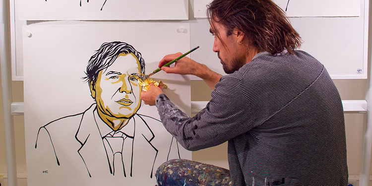 而在2017年时,诺贝尔奖委员会决定以金色呈现获奖者名字,于是尼克拉斯从2018年开始将金色元素融入到肖像画中。画像上的金色部分使用的并不是普通的金色颜料,而是一种可以用特殊胶水涂在画上的超薄金属箔。这种独特的绘制技巧,使得白色背景上的金色部分与黑色轮廓相映成趣,为画像增添了别样的魅力。