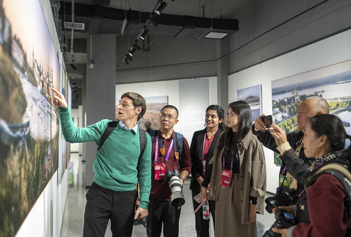 2025年11月16日,张家界市大庸古城世界遗产影像馆,中外观众在“观山阅界——金砖国家影像联盟世界遗产摄影展”展区观展。徐迅 摄