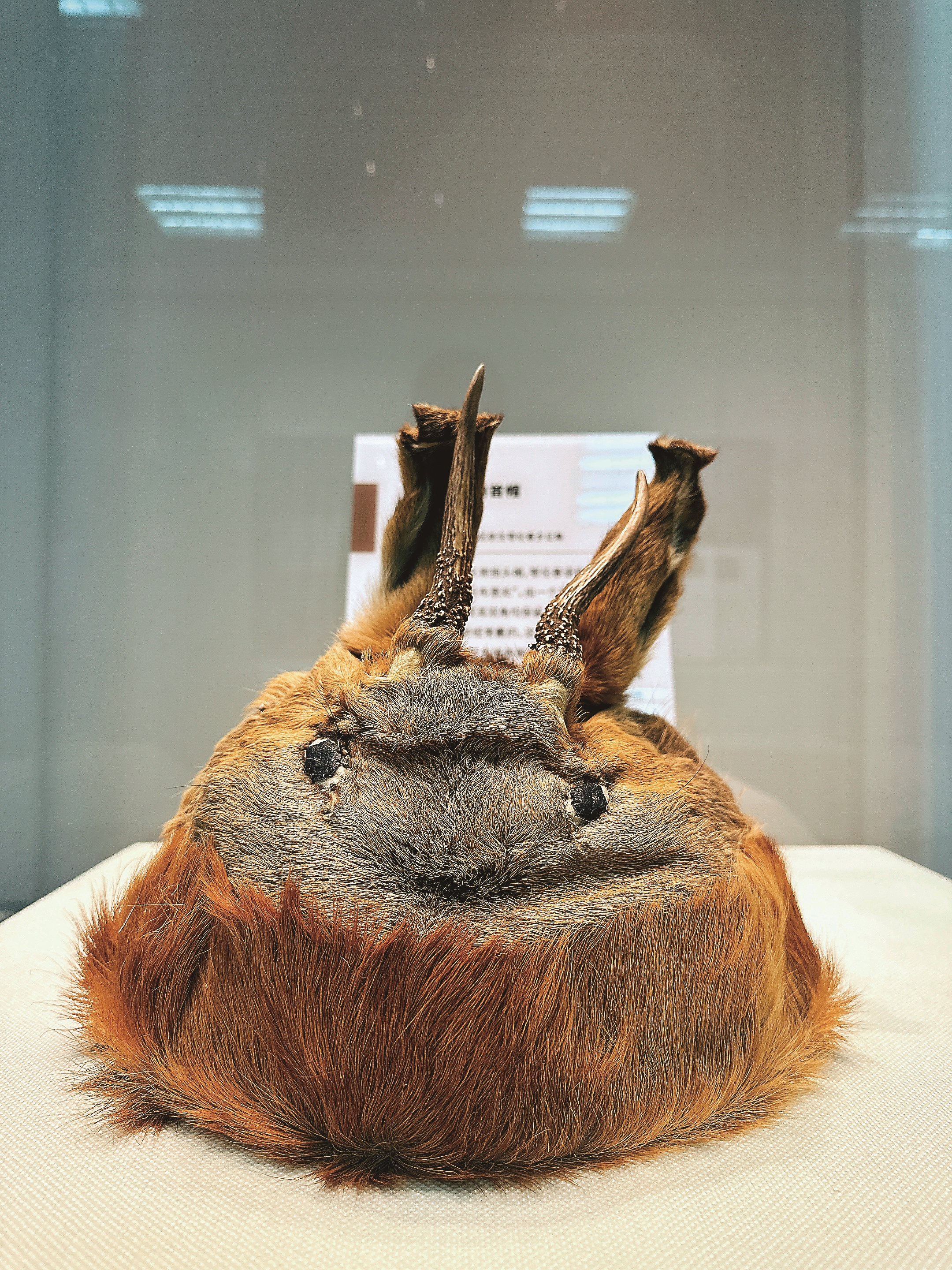 展品中,看起来毛茸茸的“狍头帽”受到观众的围观。这是一种用秋季狍子的头皮制作而成的帽子,是鄂伦春族原始艺术的遗留,因外形与狍子原形保持一致,故被称为“狍头帽”。