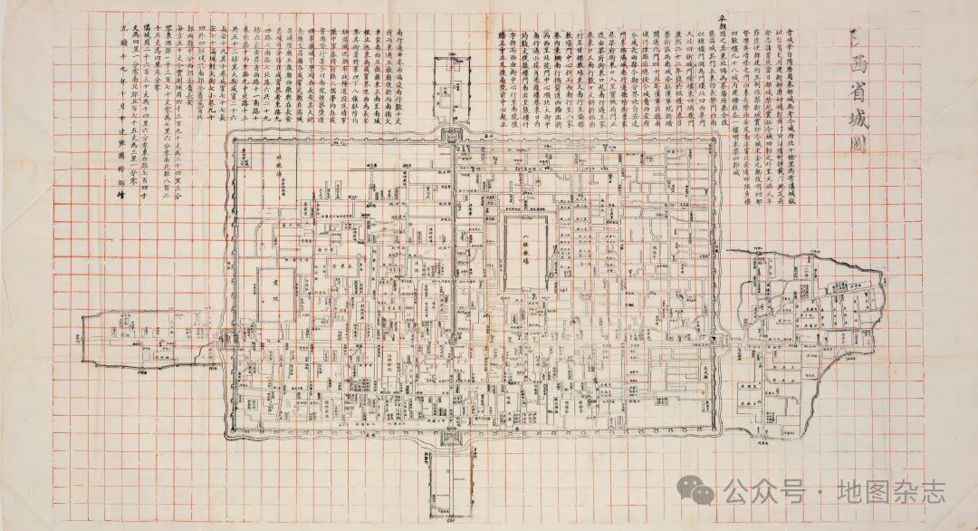 及至晚清,因清廷编绘《会典舆图》之需,陕西舆图局于光绪十九年(1893年)十月,专门绘制了一幅《陕西省城图》。然而,因《会典舆图》不收录城市地图,该图于光绪二十五年(1899年)单独刊印。《陕西省城图》宽98.7厘米,高58厘米,采用西方测绘方法,同时结合传统“计里画方”的方法,方位为上北下南。图中所绘范围为晚清西安府城,包括城墙内的城区、满城、南城以及城外的四个关城。图上方空白处附有900余字图注,记载了隋唐至清光绪年间西安的建城历史,并描述了明清西安城的规模、布局,以及城内咸宁与长安两县的分界情况。