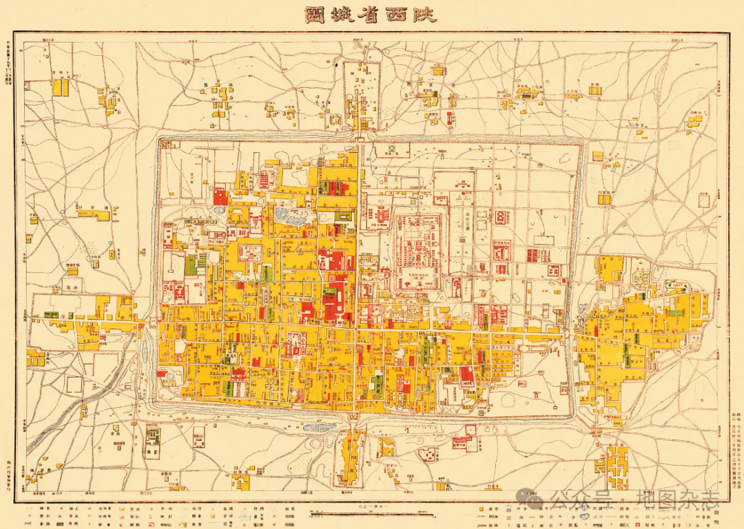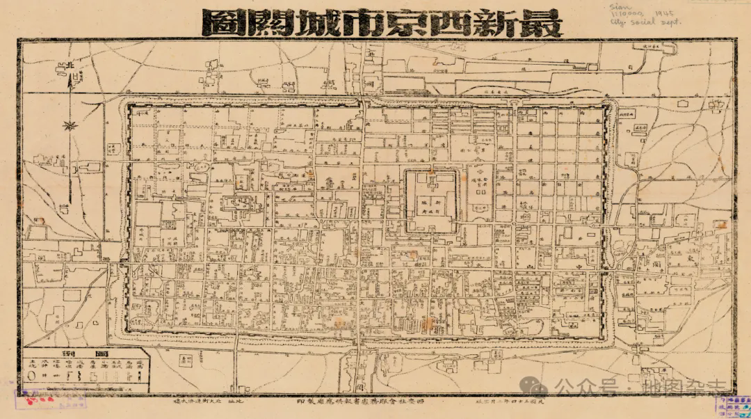 最令人瞩目的民国时期民间机构印制发行的西安城市地图,当属《最新西京市城关图》。该图由西安社会服务处书报供应处(地址在当时西安城北大街通济大楼)制印,于1945年出版发行。该图以单色印制,详细描绘了当时西安城市的变迁。图例中不仅包括水井、牌楼、墙垣、房屋、小路等传统地物信息,还增加了当时西安城的未建成马路、马路和铁路信息。特别是图中重点标注了当时西安新城的省政府所在地,以及革命公园、公共体育场、建国公园等公共空间的范围。满城在该图中已无踪迹,取而代之的是民国时期地方政府的军政机构。这不仅体现了时代的变迁,更是西安从一座传统老城向近现代城市转型的历史见证。
