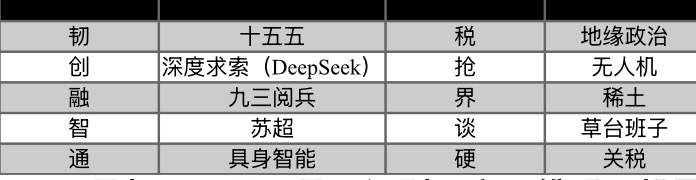 “融”“韧”性,育“具身智能”新质,“谈”“税”策,显“地缘政治”格局。12月9日,“汉语盘点2025”年度各组前五位字词正式出炉,“韧”“创”“税”“抢”“十五五”“苏超”“地缘政治”“稀土”等热门字词入围。