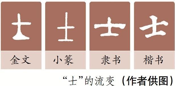 先说“士”字。“士”的金文像一把长柄、宽刃的战斧。后来,斧子的刃变成了一短横,字形就演变成了现在的“士”字。