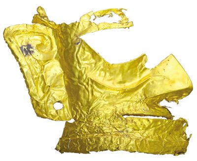 图为三星堆遗址发掘现场出土的金面具残片。四川省文物考古研究院供图